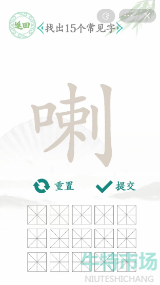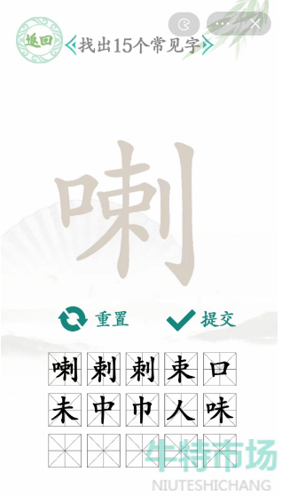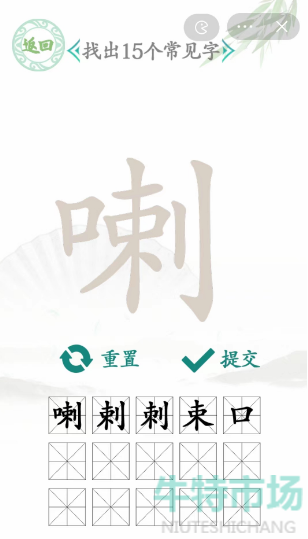 1、进入到游戏关卡可以从复杂到简单的部首拆分可以得出:喇、剌、刺、束、口;