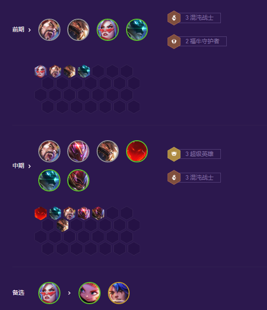 泰隆三星后升级6人口开3混沌+3超级英雄,如果阵容3星比较少,触发超级英雄效果不明显,可不开3超级英雄羁绊,先开2福牛增加泰隆的攻速与保命能力。升级7人口后添加阿利斯塔开2福牛羁绊,如果卡蜜尔追三星困呐,来佛耶戈可换下卡蜜尔,后追除佛耶戈外所有棋子三星,如果外面有超级英雄同行,追三星较难,就升级8人口添加菲奥娜开4福牛羁绊。