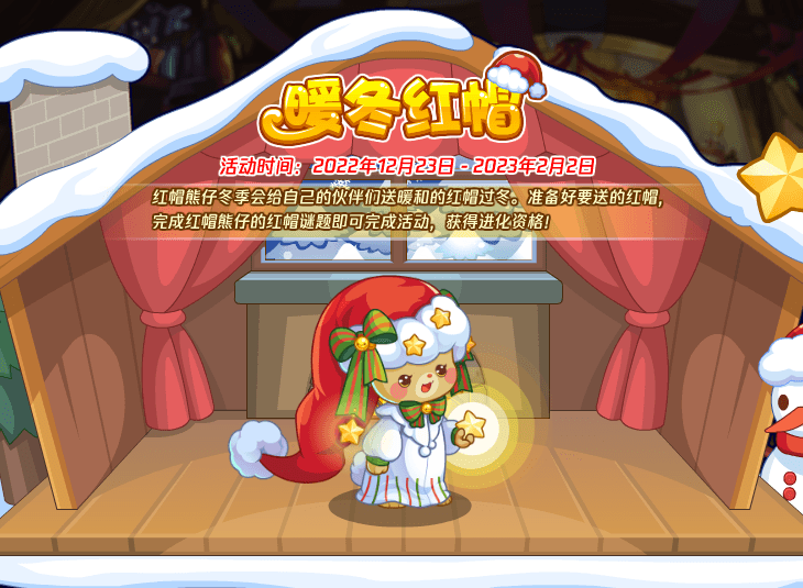 红帽熊仔冬季会给自己的伙伴们送暖和的红帽过冬。准备好要送的红帽,完成红帽熊仔的红帽谜题即可完成活动,获得进化资格!