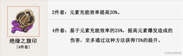 绝缘4件套:雷神专属圣遗物,提升元素充能效率和大招伤害。雷神天赋充能转化成雷伤,因此也提升雷元素伤害加成。