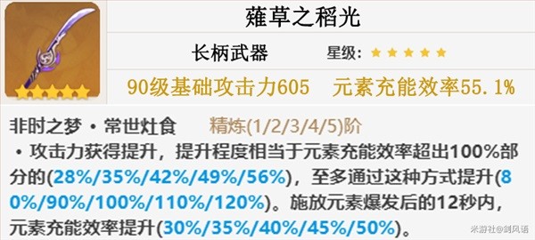 薙草之稻光:五星首选,雷神专武,拥有极高的元素充能效率,同时基于充能提升攻击力获得加成,基于这个特效,只要充能足够,雷神是不缺攻击力的,所以圣遗物杯子可以带雷伤。