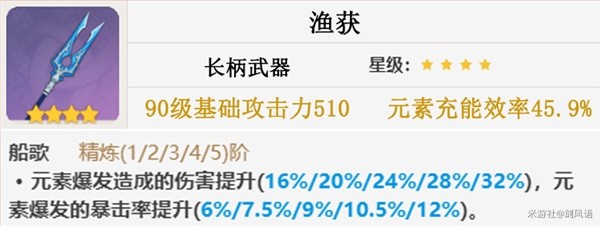 渔获:四星专武,增加元素充能效率,提升大招暴击率和伤害,与雷神非常契合。